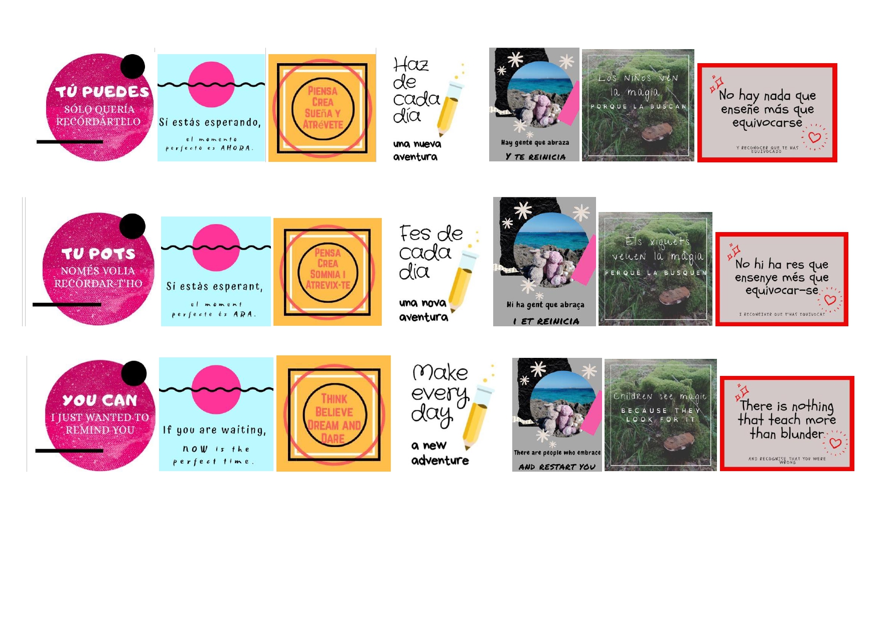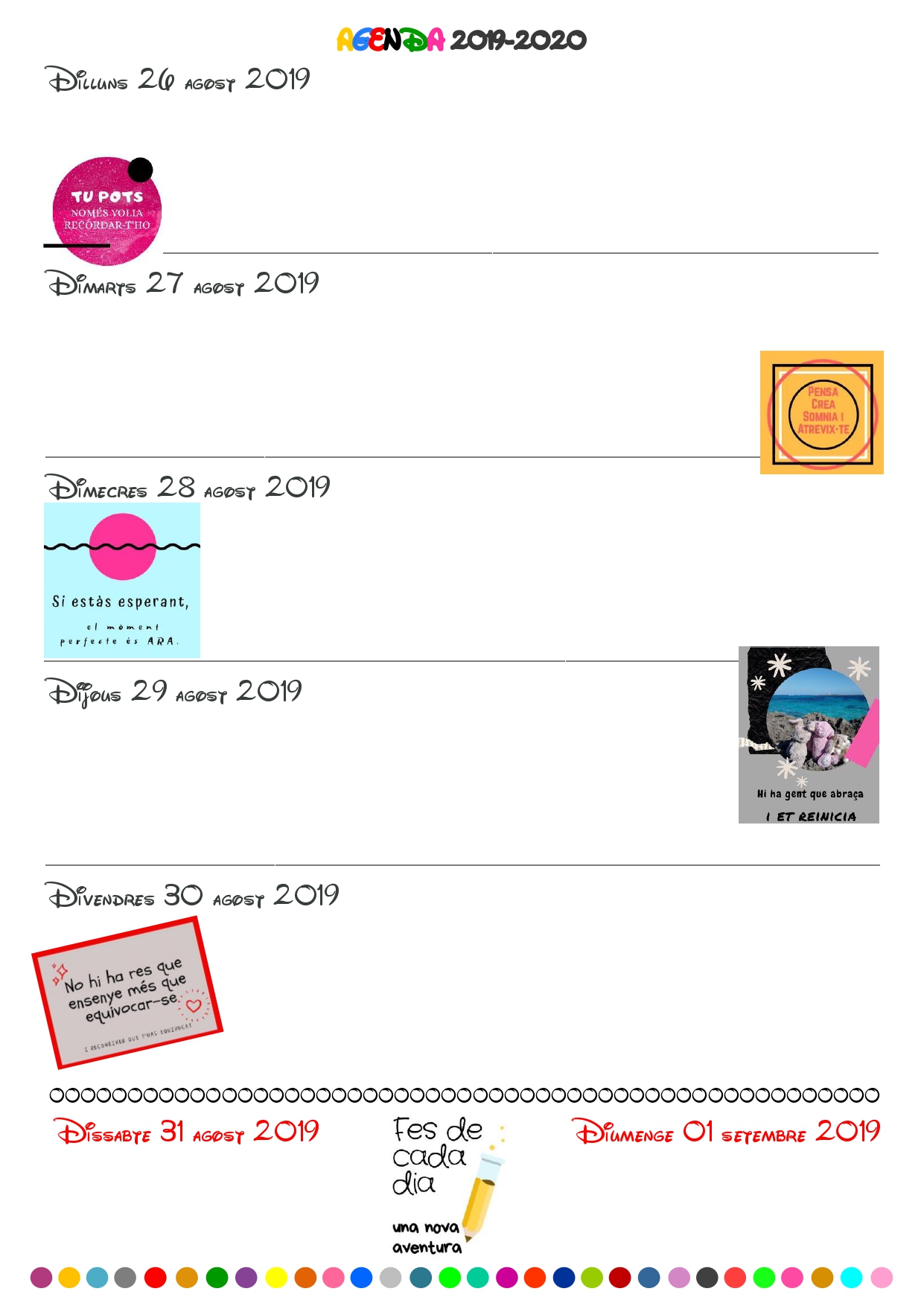 Us presente com avanç les imatges que he dissenyat amb frases que m’agraden perque m’acompanyen tot l’any, em motiven i em recorden que s’ha de donar sempre el millor de nosaltres mateix. També us fique la plantilla de les meues agendes en A4. La plantilla A5 està en construcció, així com altres documents per l’organització docent. En breu espere tindre els materials preparats per a descarregar. He de reconéixer que em costa controlar WordPress, encara que em sembla que té milions de possibilitats.