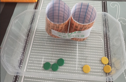 _ A continuació introduïm el número de xiclets que tenim a la màquina comptant en veu alta. Podem dibuixar els xiclets o ficar objectes com pompons, fitxes, construccions…