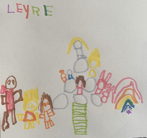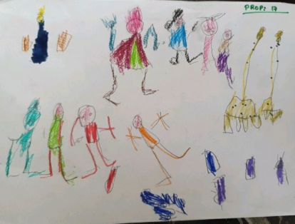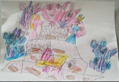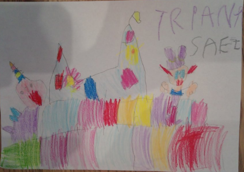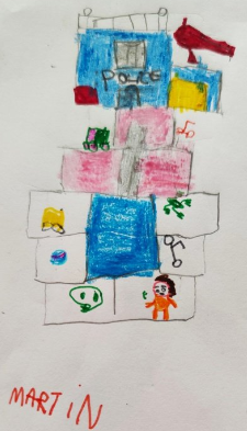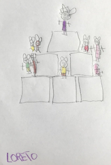 ¡Toda una obra de arte! Pero dejando aparte la construcción de la que ya hemos hablado, el trabajo de representación gráfica es muy interesante. Llevar al papel una construcción implica muchos aspectos: conteo de los rollos de papel y objetos decorativos, estudio del espacio a dibujar, de las dimensiones y características de los objetos, interpretación del espacio tridimensional para realizar la representación en papel tratando de mantener las proporciones y dibujar tal y como lo ven en su propia construcción. Es un trabajo de arquitectura e ingeniería donde las matemáticas son lúdicas pero muy efectivas porque estamos aprendiendo geometría sin saberlo. Si, jugando se aprende. Y mucho.