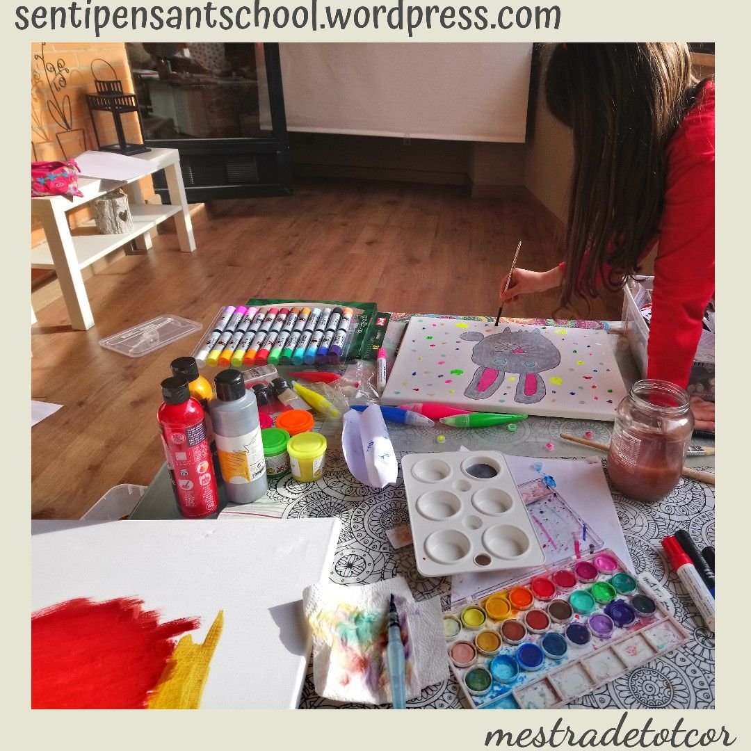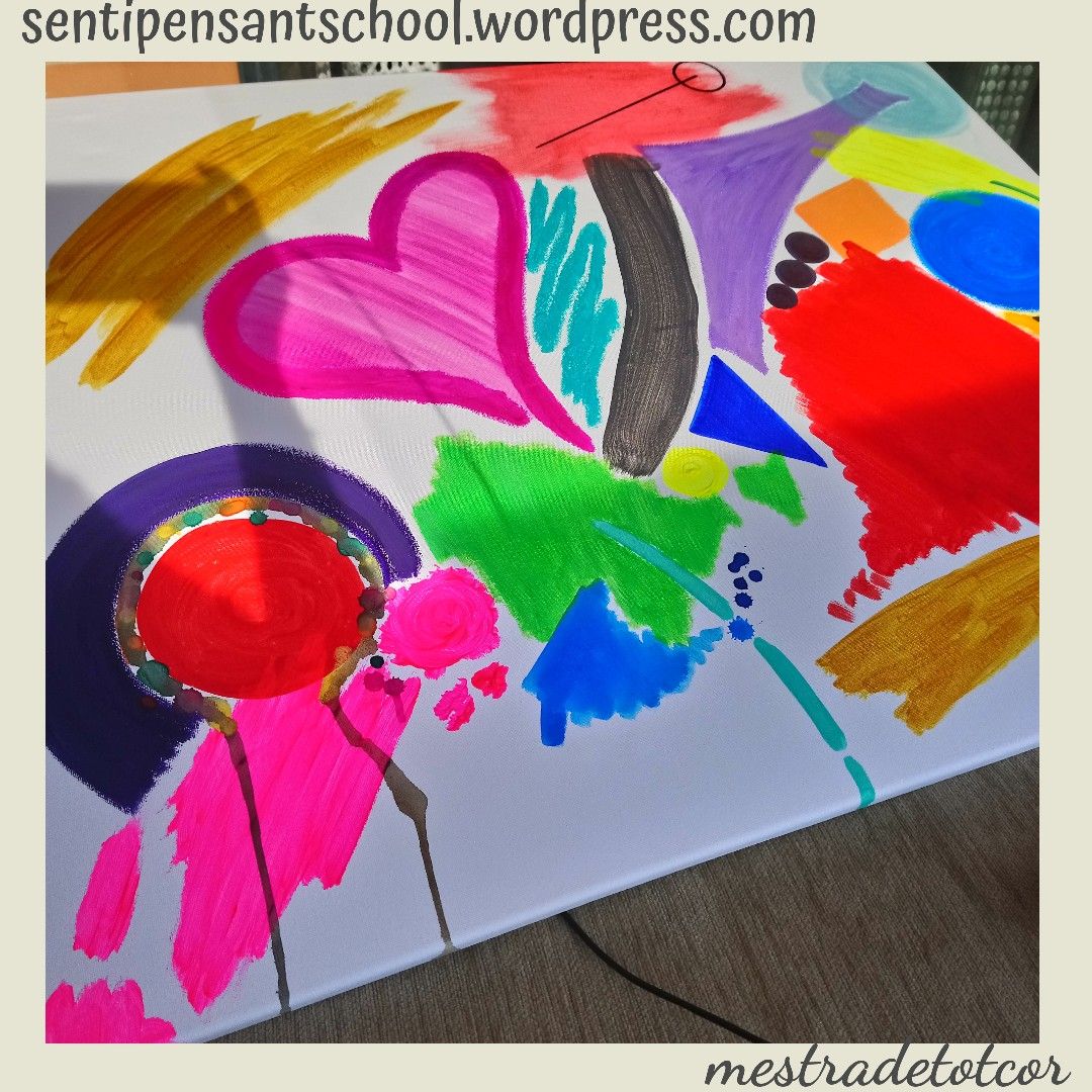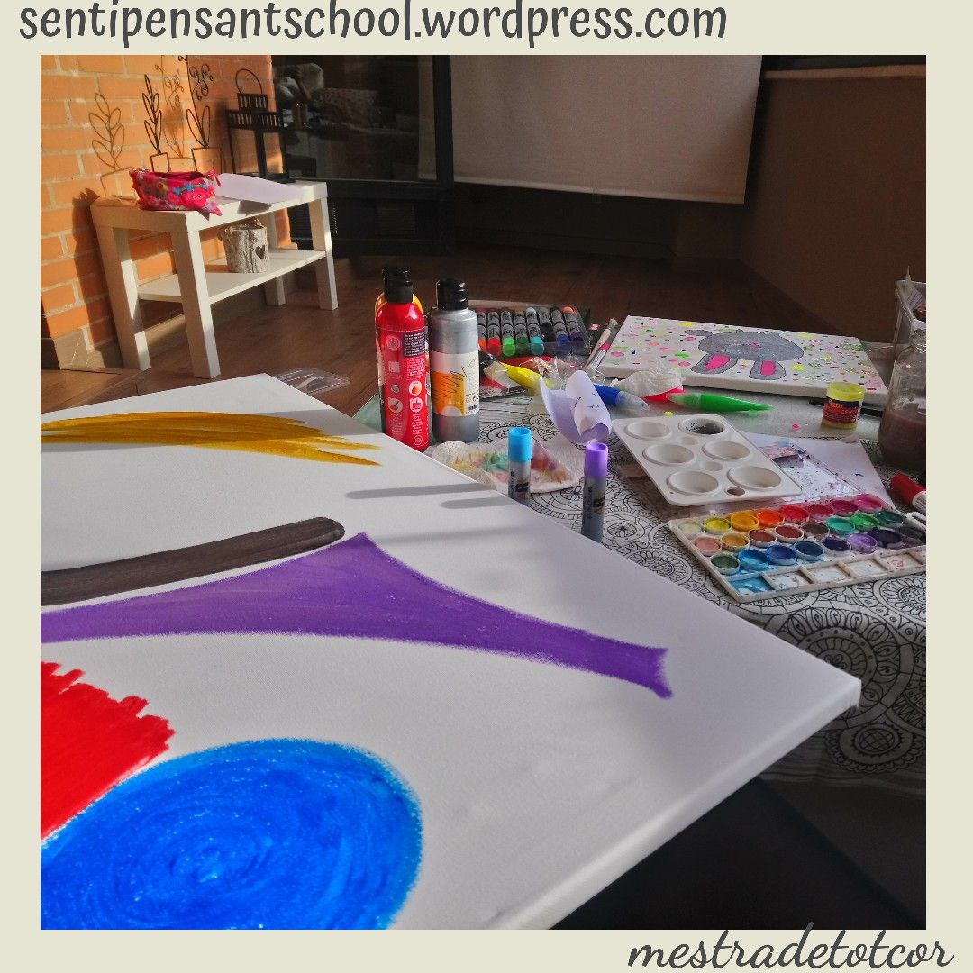 Aquest és el meu quadre, resultat d’una vesprada escoltant música i pardalets al carrer, al solet de la terrassa, mirant les pintures i decidint segons anava fent. Mestrestant disfrutava de mirar a Paula fer el seu propi quadre i compartir eixos moments amb ella. Crec que faré més a sovint aquestes coses perquè me fan sentir genial!!!