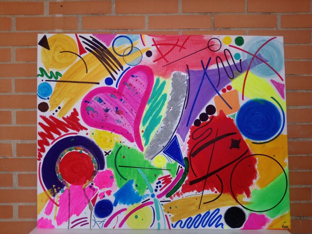 Jo tenia un llenç preparat fa molt de temps per a ficar-ho a la meua terrassa però, com la vida va tan de pressa, mai no trobava el moment, les ganes, l’energia… per a pintar-ho. Excuses. Així que ara que estem a casa i donat que la terrassa està fent que aquest confinament estiga ple de llum, aire i solet, tenia ganes de ficar-li el punt de color que necessita la vida per a plenar-la d’alegria. No és un quadre espectacular, per supost, però és el meu quadre i ,això, és el que té d’important i d’especial. Tampoc he tardat mesos a pintar-ho, una vesprada només. Ni he fet esborrany ni eixes coses. Només tenia clara una cosa: molt de color i anar improvisant segons el moment. I a més a més jugava amb els materials que tinc a casa: diferents tipus de pintures i retoladors. I la pintura la vaig aplicar amb diferents tipus de pinzells i esponges. Un resultat abstracte i divertit. Sense més pretensions que donar-li color i recordar aquesta estància a casa amb certa alegria, compartir moments especials amb la meua filla, reconnectar amb el meu jo creatiu perquè el confinament no el plene de tristor, ficar a prova la meua pròpia inseguretat…