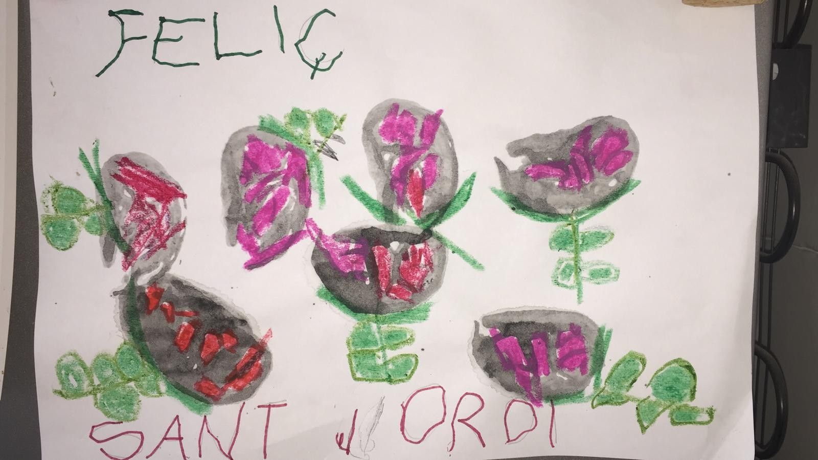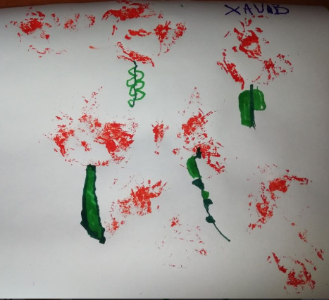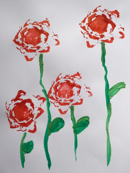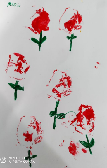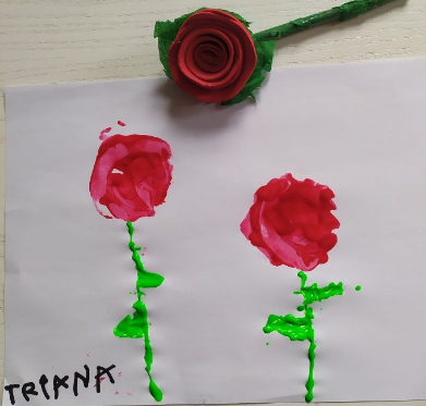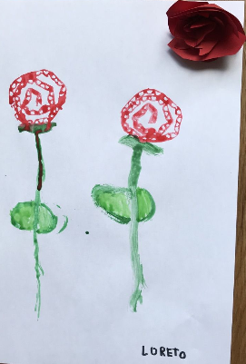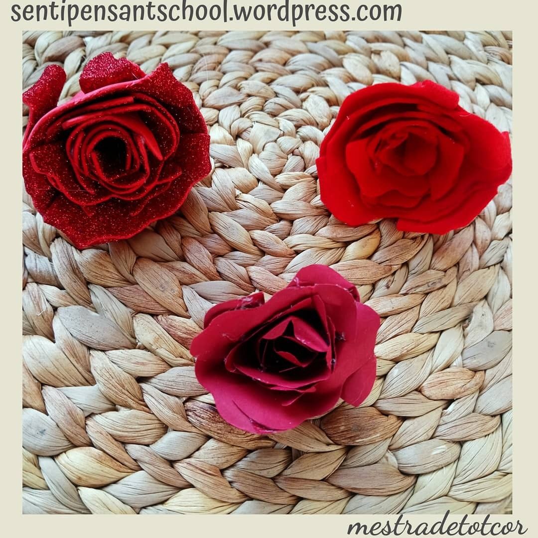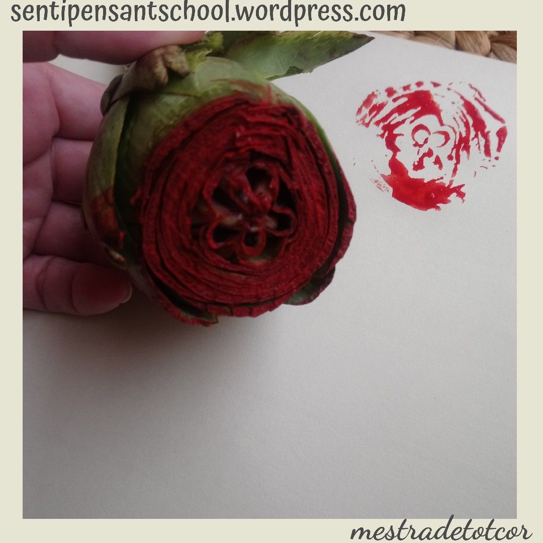 A més a més hem preparat roses. Així que us les regalem amb mooooolta il.lussió!!! Les hem fet amb diferents tècniques i materials que teniem per casa. Les estampacions les hem fet també amb diferents verdures com carxofes o encisams, amb cartons, esponges… Esperem que vos agraden i us animeu a fer les vostres.