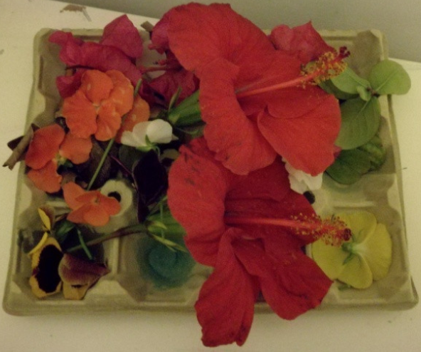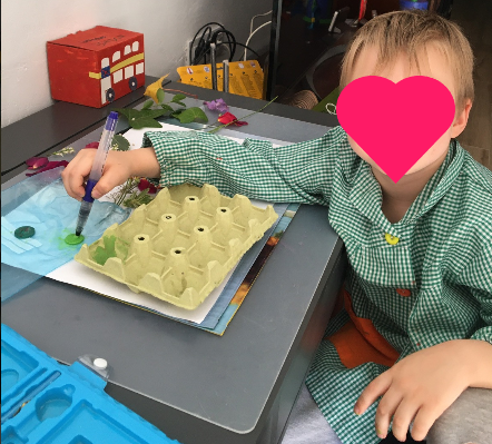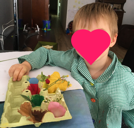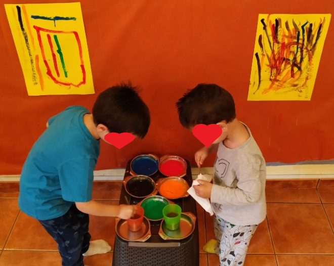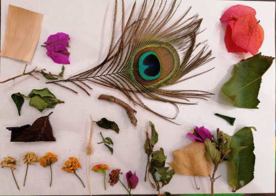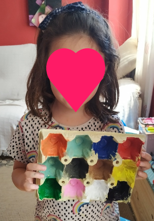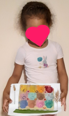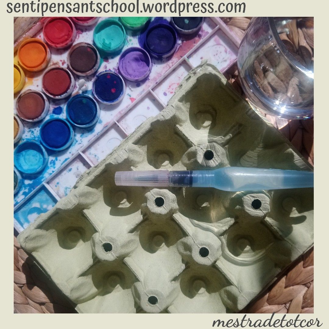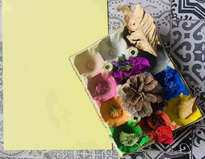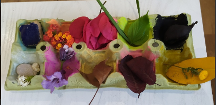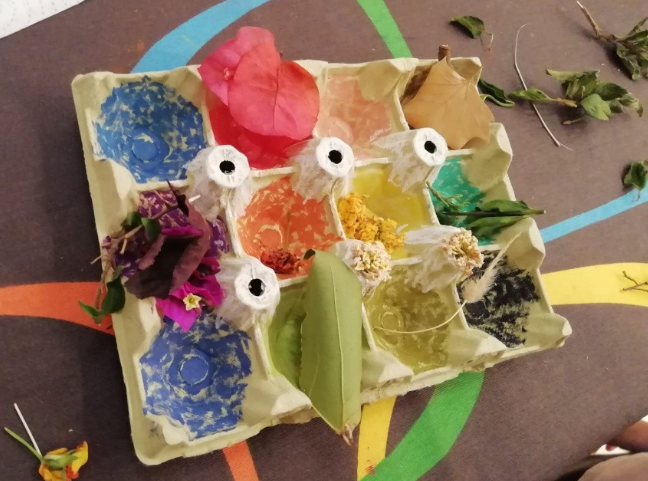 Ja sabia jo que quedarien super xules. Són molt artistes!!! Les seues calaveres tenen molt de color, flors, papallones… Això és molt primaveral i m’ha donat una altra idea: estem en primavera i el nostre entorn està ple de flors. Així que anem a aprofitar el nostre passeig diari per arreplegar materials naturals de l’entorn però abans, anem a preparar una safata especial amb diferents colors… Mireu què coses tan senzilles es necessiten…