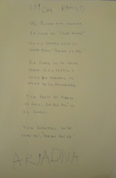 El siguiente paso fue la recogida de material traído desde las casas. Cuentos, carteles… Y empezó el proyecto de descubrimiento de Frida KAhlo. Descubrimos de dónde era, dónde vivía, qué le pasó, porqué es conocida, su obra… La enfermedad que padeció de pequeña nos hizo empatizar y, desde un principio, nos encantó trabajar sobre su vida.