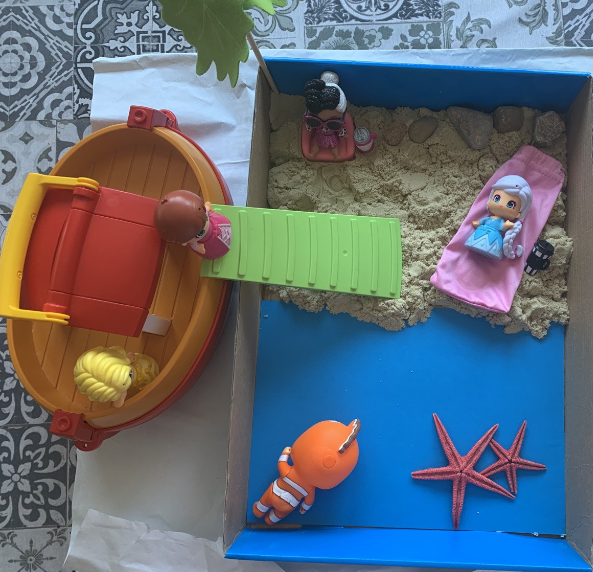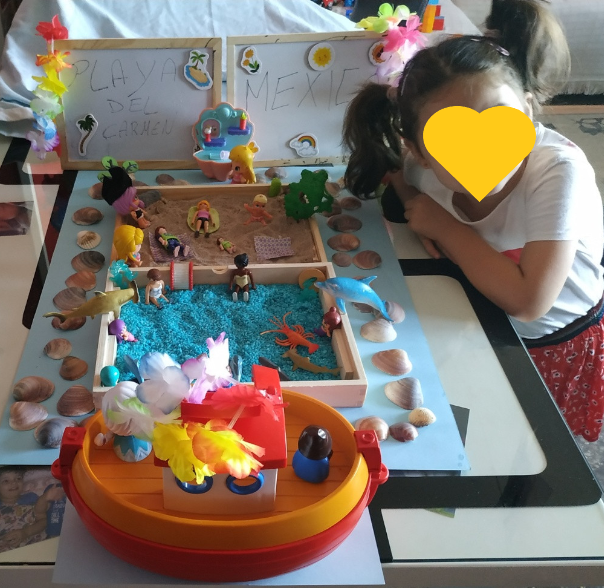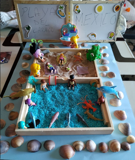 Què són els minimons? Els minimons permeten al xiquet/a realitzar escenaris mentals, és a dir, representar de forma gràfica un context o una imatge que visualitza mentalment i fer-la realitat. És una forma de joc simbòlic en miniatura, on es crea un escenari del seu entorn, un escenari llunyà, un escenari imaginari… És un aprenentatge significatiu, experimental, sensorial, enriquidor, constructiu, científic i fantàstic a la vegada, simbòlic, d’Educació Emocional… És una activitat molt completa i mai és igual. Potencia la imaginació, la creativitat, la informació sobre el món social i cultural, el vocabulari específic, les habilitats comunicatives i emocionals, la motricitat fina… Aprenem jugant. En aquest cas, anem a apropar-se a aquesta forma de joc construint un minimón de la platja. En primer lloc necessitem una superfície on muntar el nostre món. I després, materials per a fer realitat el nostre minimón de platges mexicanes.
